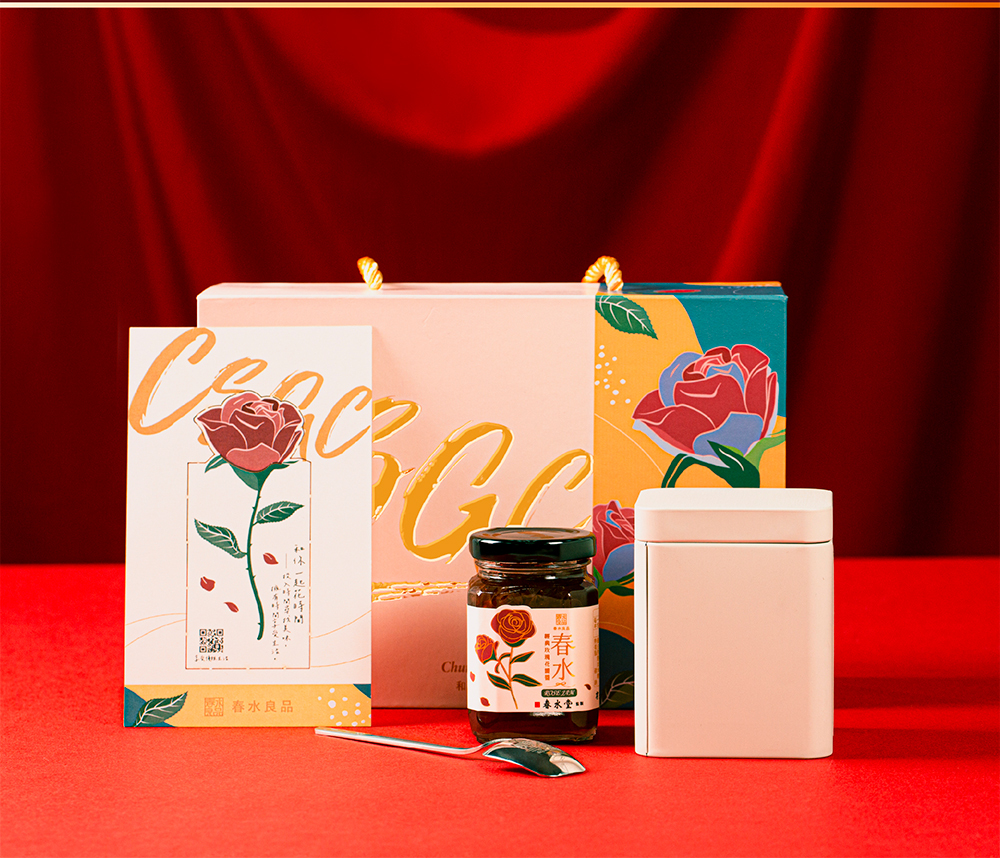 春水堂經典復刻回歸的「玫瑰花瓣醬」與「蜜香紅茶」搭配做為送禮禮盒,禮盒內附加「品牌果醬匙」與「暖心書籤卡」共譜出令人嚮往的甜蜜組曲。