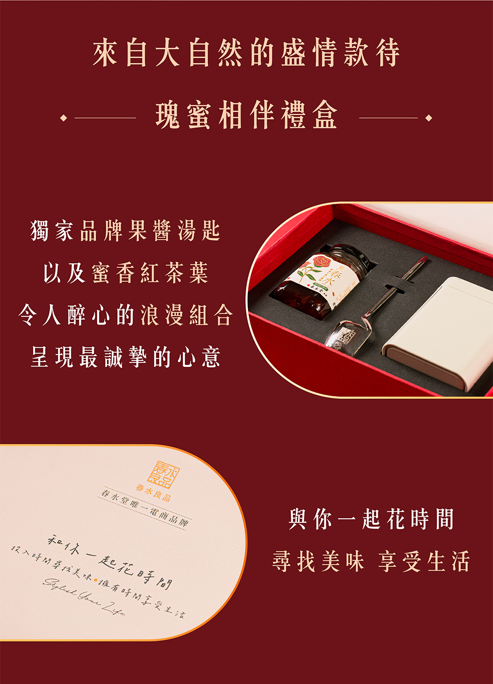 春水堂經典復刻回歸的「玫瑰花瓣醬」與「蜜香紅茶」搭配做為送禮禮盒,禮盒內附加「品牌果醬匙」與「暖心書籤卡」共譜出令人嚮往的甜蜜組曲。