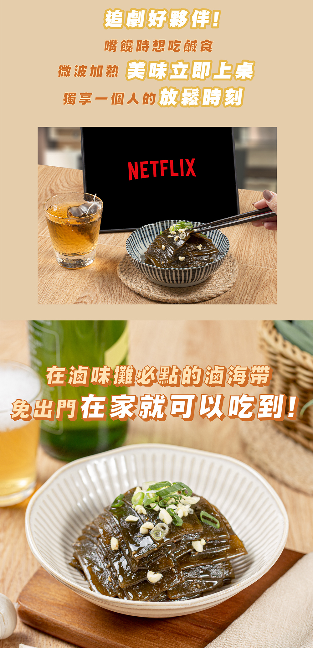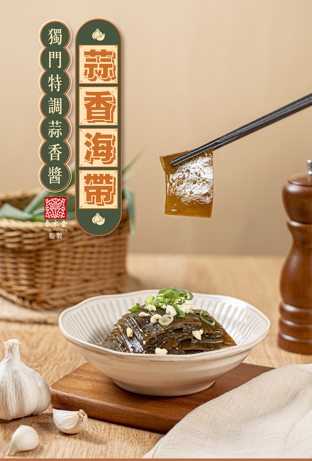 嚴選口感柔韌的新鮮海帶,營養價值極高。春水特製香濃滷汁拌入新鮮蒜頭、沙茶胡椒醬,濃郁蒜香加上特製醬料提味,海帶吸飽滿滿醬汁,又香又入味。嘴饞夜宵立即開盒享受,絕對是下酒小酌首選。