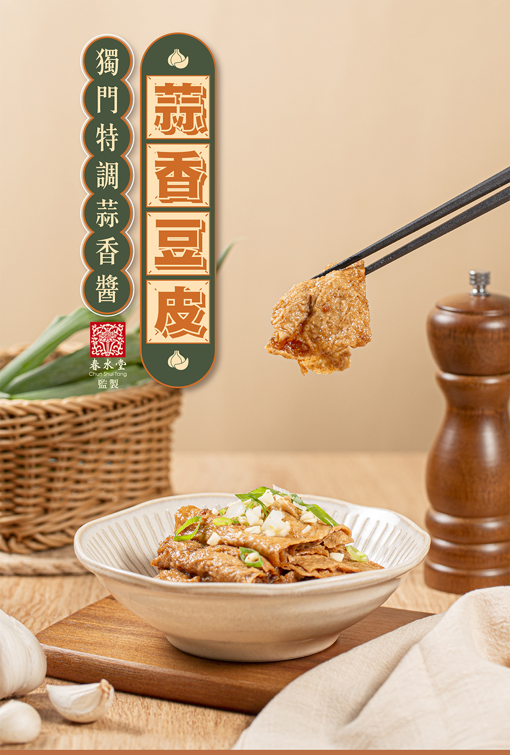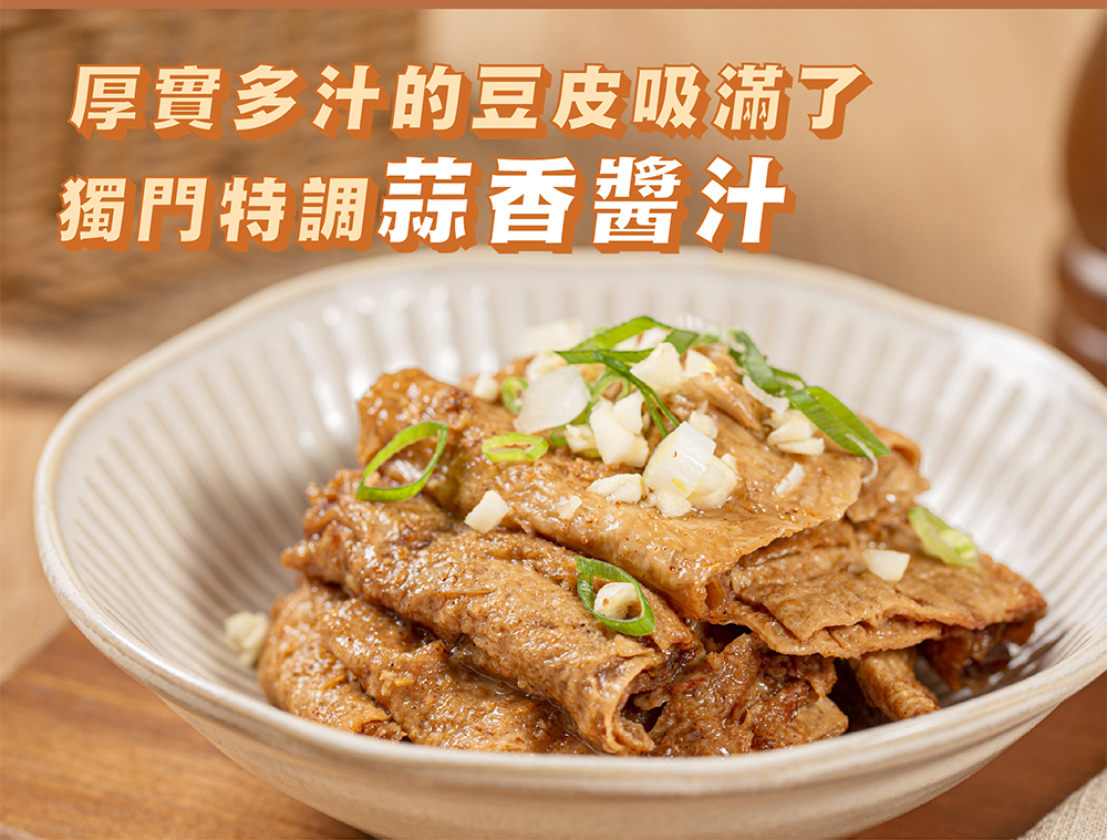 特選西螺產製特厚角螺豆皮,飽水多汁。春水特製香濃滷汁拌入新鮮蒜頭、沙茶胡椒醬,濃郁蒜香加上特製醬料提味,更襯托豆皮鮮甜。嘴饞夜宵立即開盒享受,絕對是下酒小酌首選。