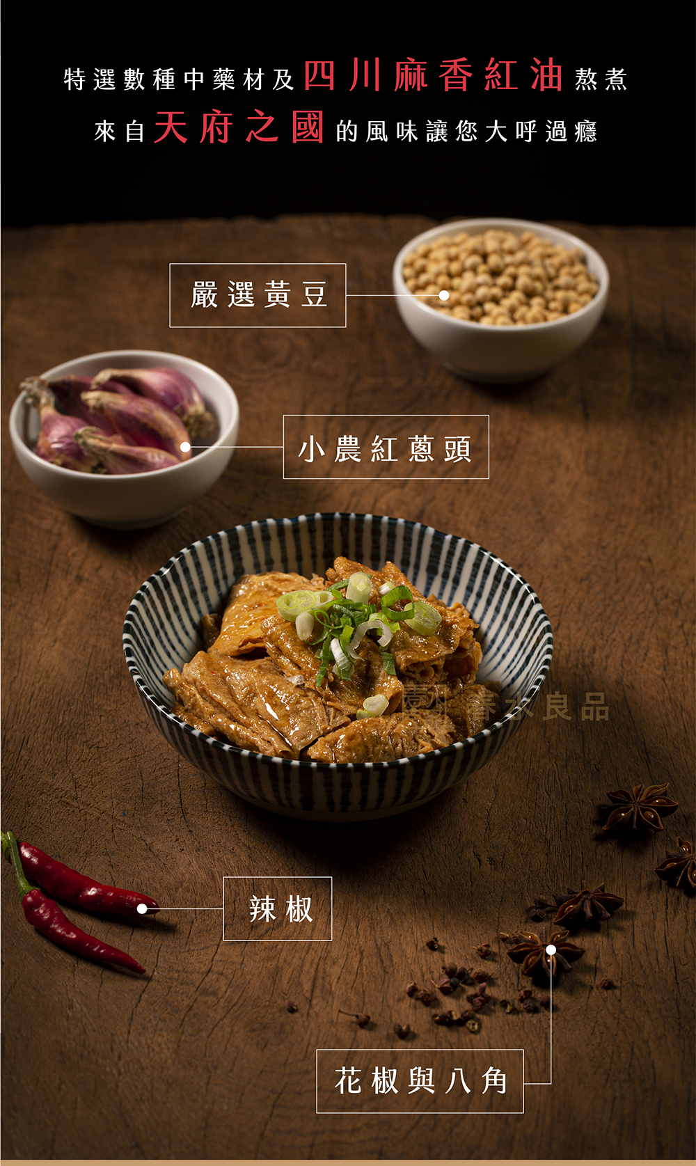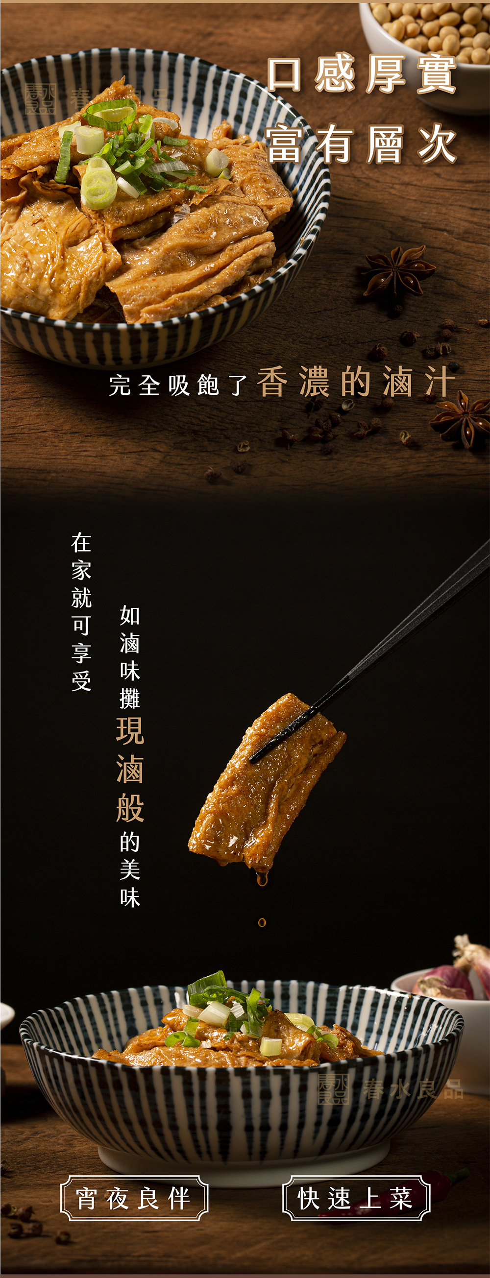 獨門滷汁結盒厚實多汁的豆皮,入口香濃,滷汁飽滿。特選數種中藥材,加入四川麻香紅油,畫龍點睛更加鹹香開胃。不論是午茶解饞、宵夜小酌,隨時都能品味現滷不凡滋味。