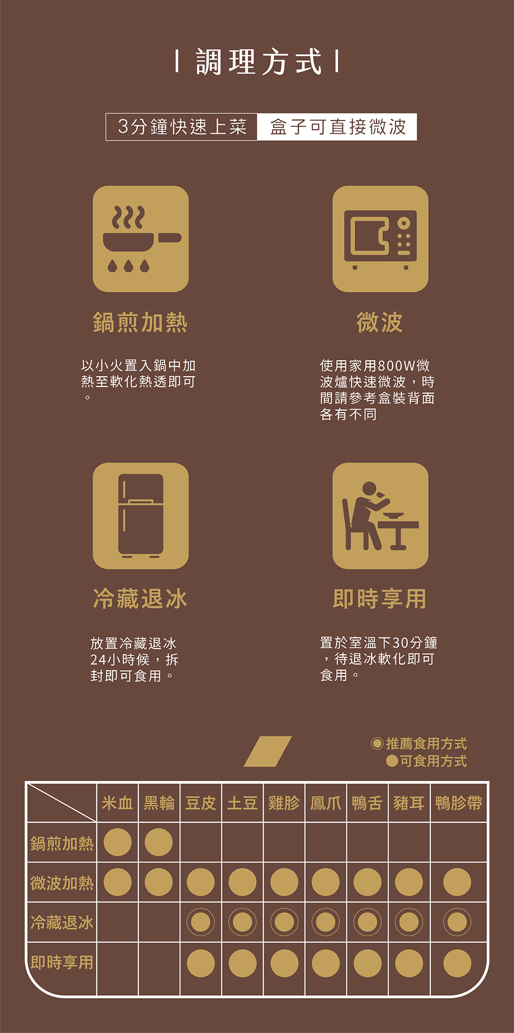 (1)冷冷吃:不拆封,冷藏解凍或流水解凍,待食材退冰變軟,即可食用。