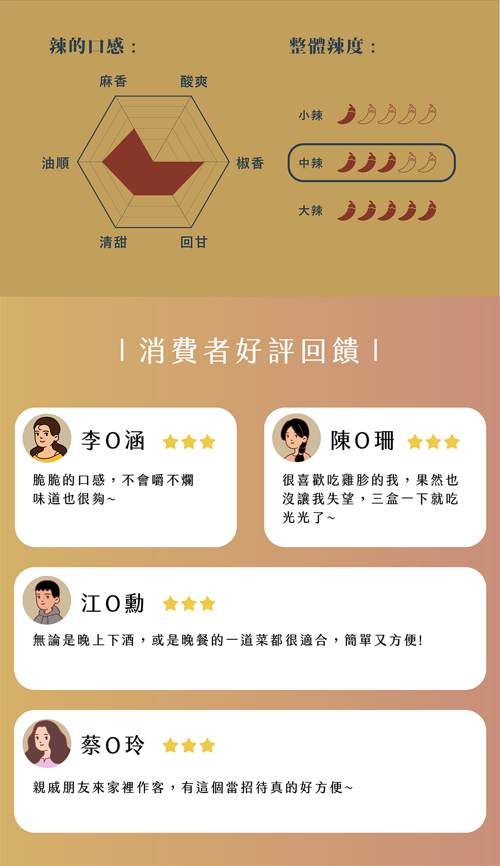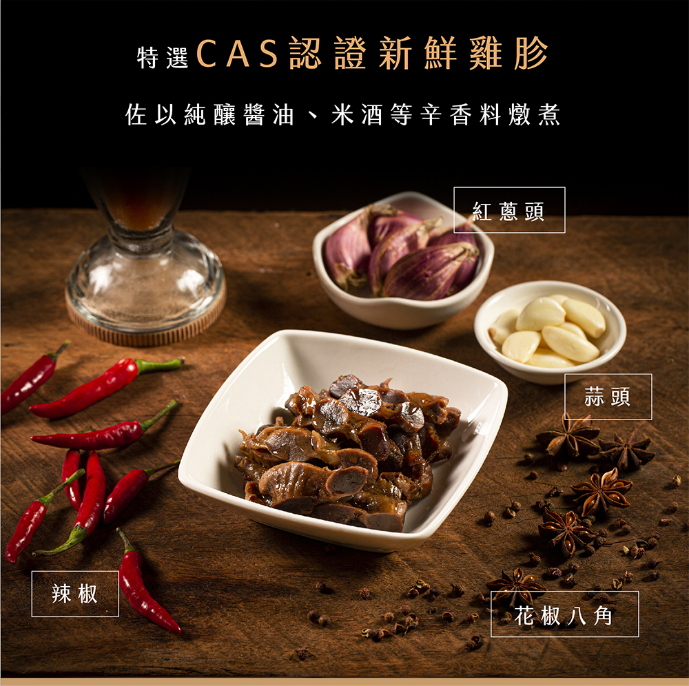 特選CAS認證優良廠家雞胗,經過十數道繁雜加工程序製成,手工切片,Q彈脆口無腥味。特選數種中藥材,加入四川麻香紅油,畫龍點睛更加鹹香開胃。不論是午茶解饞、宵夜小酌,隨時都能品味現滷不凡滋味。