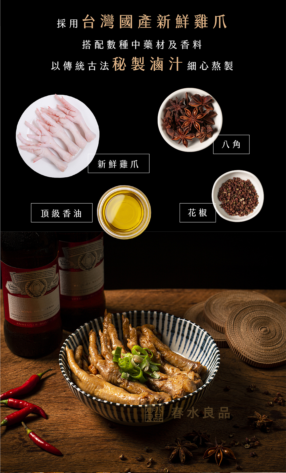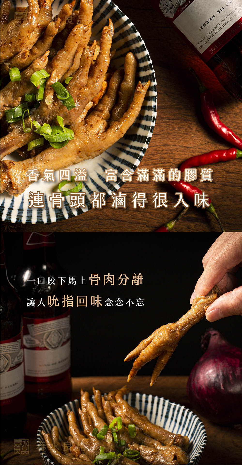 使用特選國產雞爪,吃得到滿滿彈牙的膠質。特選數種中藥材,加入四川麻香紅油,畫龍點睛更加鹹香開胃。不論是午茶解饞、宵夜小酌,隨時都能品味現滷不凡滋味。