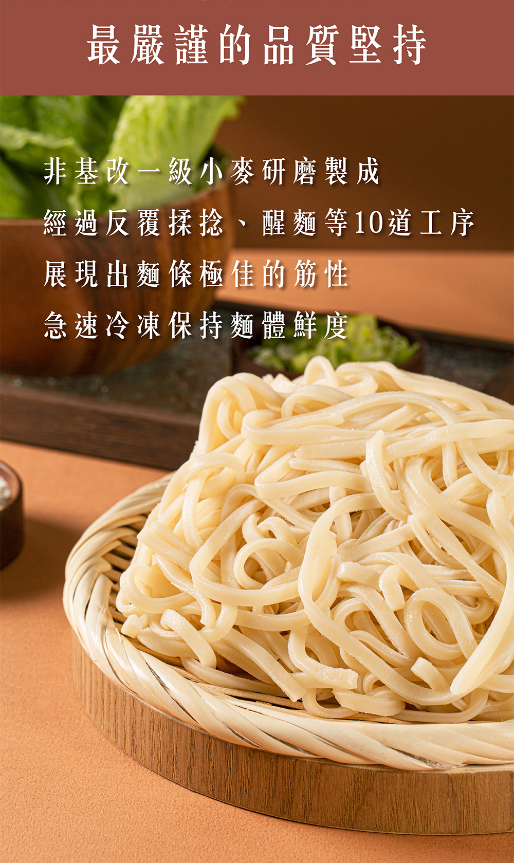 經過多道工序製成,能完美吸附所有醬汁、湯汁。急速冷凍保持麵體新鮮,口感Q彈又順口,嘴裡咀嚼散發淡淡麥香。冷凍熟麵,快煮不費力,適合做各式麵料理。