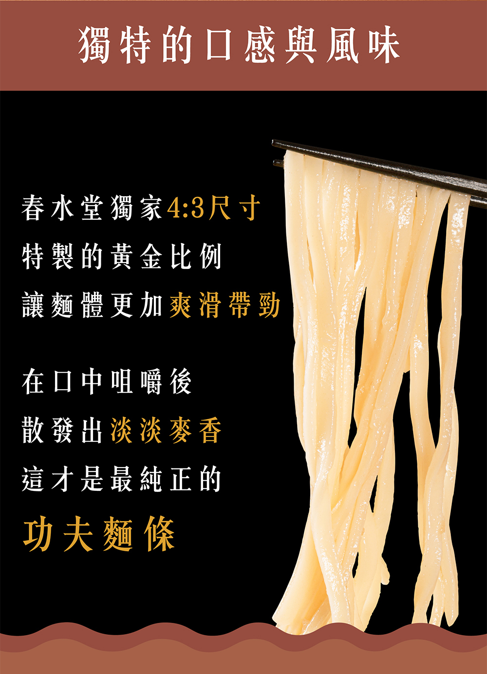 最純正的春水功夫麵條,春水堂獨規尺寸,特製黃金比例(寬度4mm、厚度3mm),