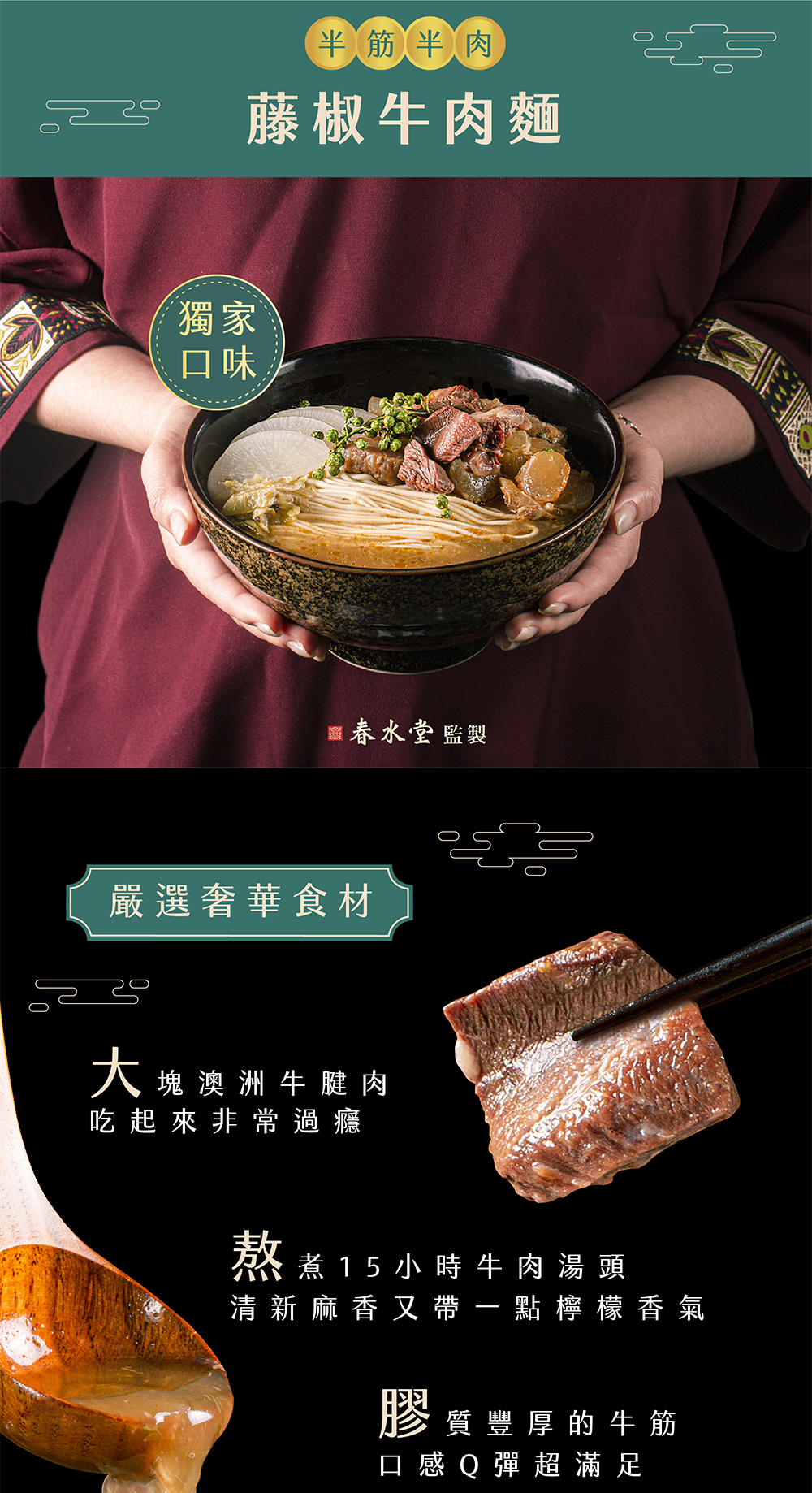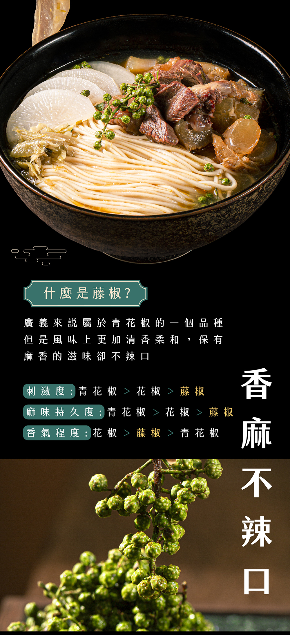 手工切製澳洲牛腱肉,精心熬製15小時的牛肉清甜湯頭,肉質軟嫩入味,結合上選藤椒及多種辛香料,滋味清新鮮麻不辣口,勁爽十足。