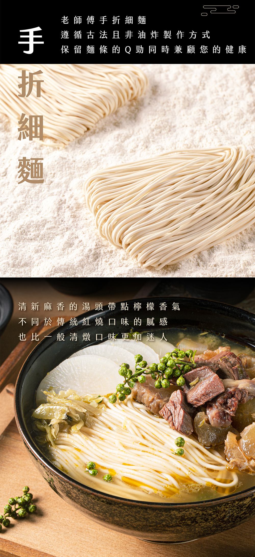 搭配遵循古法製作的非油炸手折細麵,猶如老師傅手揉、日曬、現煮的口感,品嘗一口,絕對讓您意猶未盡。