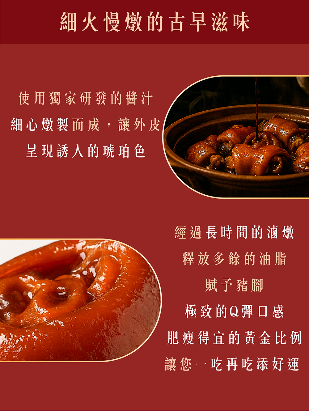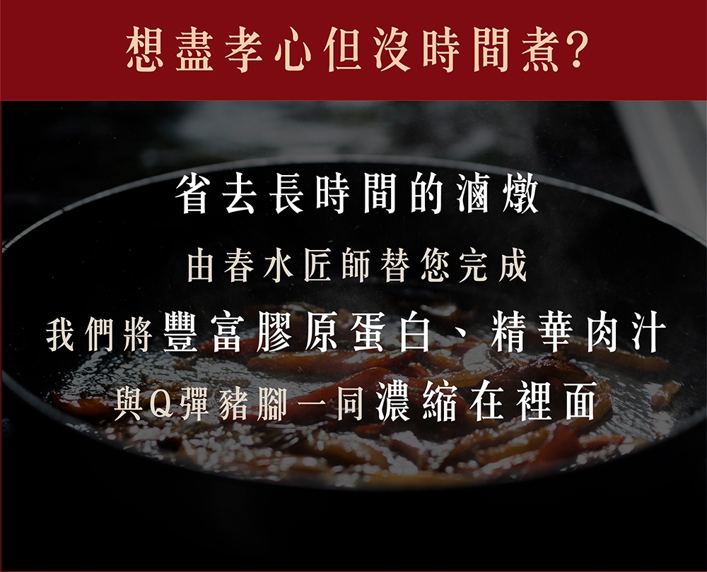 精選台灣優質豬腳,搭配春水秘製醬滷配比,精心燉煮。