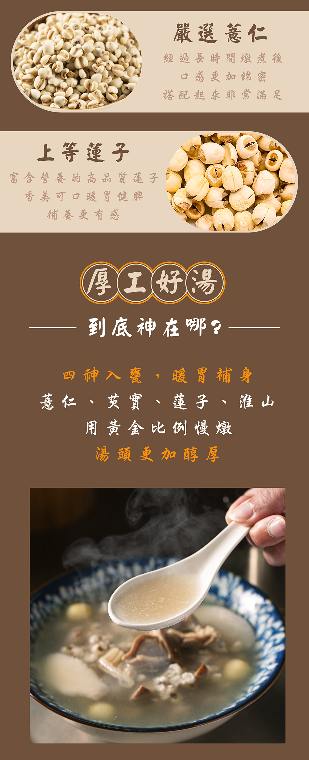 嚴選Q彈豬肚,搭配薏仁、芡實、蓮子、淮山,以黃金比例細火慢燉2小時,熬出醇厚溫潤的湯頭。純米酒提香,風味濃郁不腥,暖胃補氣,四季皆宜。簡單加熱即享,讓忙碌的日常也能即刻滋補。