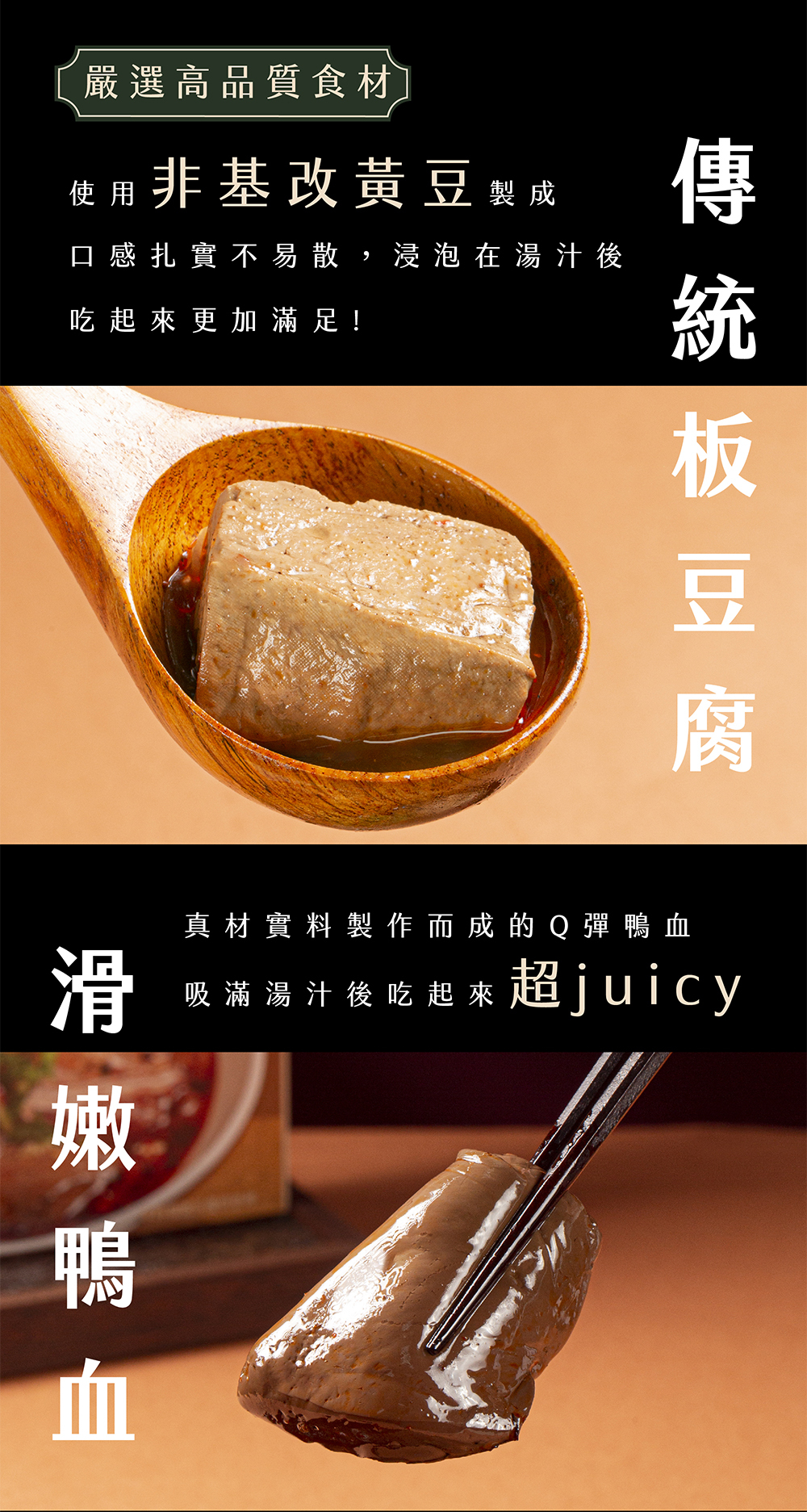 搭配秘製湯頭不含牛油,滷到入味的板豆腐搭配juicy嫩鴨血,